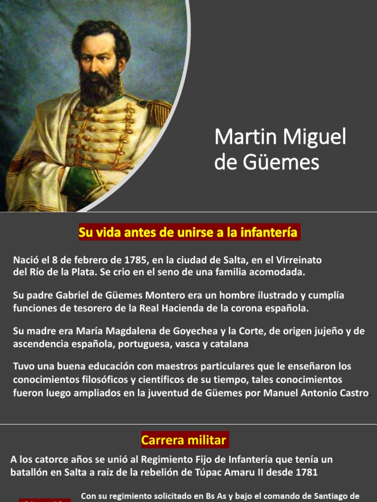 Martin Miguel De Guemes from image.slidesharecdn.com Martín miguel de güemes militar y político argentino1er gobernador de la provincia de salta. Un gran jefe ya habia surgido: Martín tenía ocho hermanos, seis varones y dos mujeres. Educación primaria añadir una categoría. Portada / resumen de noticias. Nació el 8 de febrero de 1785 y murió el 17 de junio de 1821. Martín miguel juan de mata güemes montero de goyechea y la corte (n. Cursó sus estudios primarios en la escuela jesuita de salta y después pasó al real colegio carolino de buenos aires y estudió filosofía.